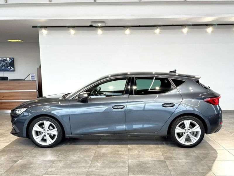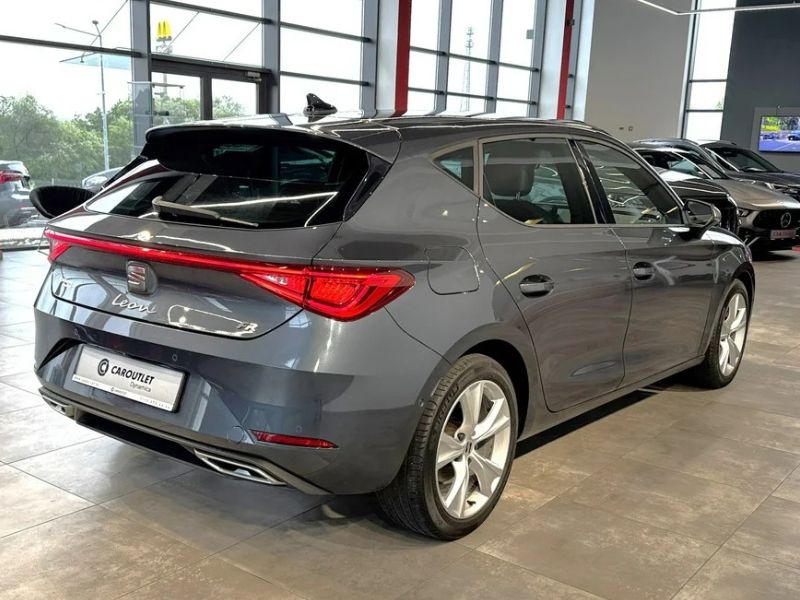 Seat Leon przyciąga wzrok agresywnym przodem z ostro zarysowanymi reflektorami. Charakterystyczne przetłoczenie na drzwiach podkreśla ruch nawet w stanie spoczynku. W wersji FR znajdziesz 18-calowe felgi i podwójną końcówkę wydechu.